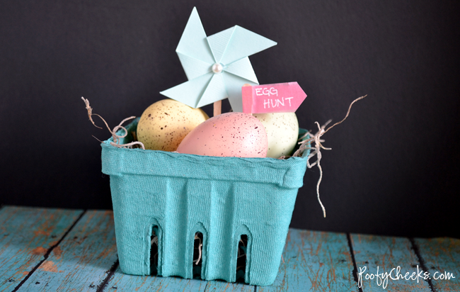 I started out with a berry basket that I purchased from Bake It Pretty because it was the perfect container size and color! I filled it with Spanish moss and faux speckled eggs I found at T.J.Maxx. To top it off I added a mini pinwheel {mini pinwheel tutorial here} and a washi tape flag with ‘Egg Hunt’ on it. This seriously took me five minutes!